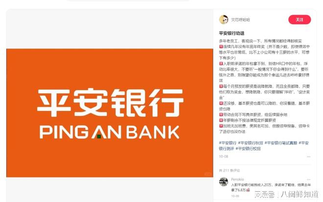 近日,网友“灾厄呀哈哈”在网上发文爆料,找工作避雷平安银行,连续几年没有年底年终奖,入职前承诺的年包拿不到,劳动合同不写具体薪资,基本薪资也是可以降的,加班无加班费。原文如下: