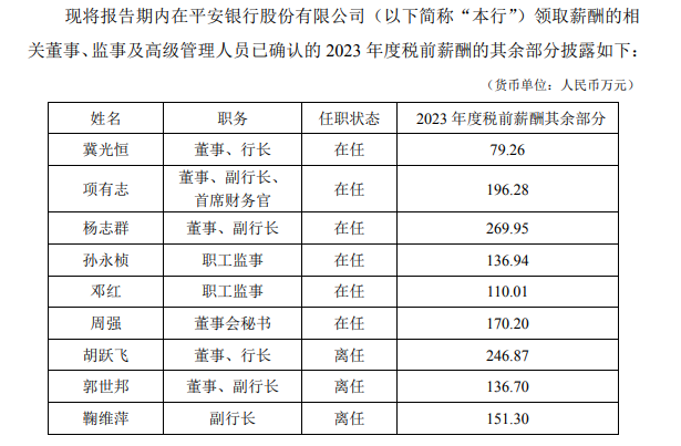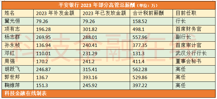 平安银行披露了9名高管2023年度税前薪酬的其余部分,包括行长冀光恒,“补发”79.26万元,加上2023年支付的79.26万,冀光恒一共税前薪酬158.52万。