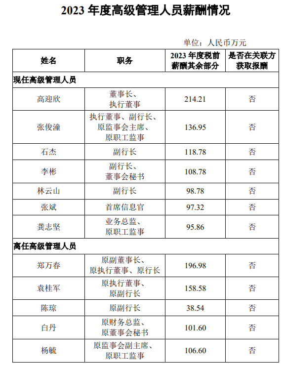 董事长高迎欣2023年度税前薪酬其余部分为214.21万,加上2023年已经发放的373.52万,合计税前薪酬为587.73万元,继续领冠上市银行高管薪酬。不过比2022年的615.38万,已经有所下降。