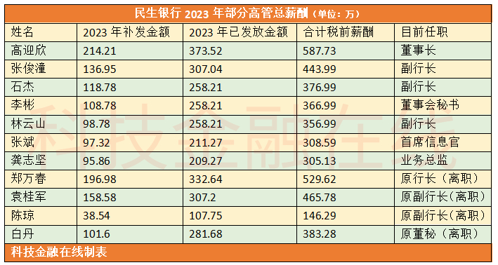 副行长杨志群剩余部分发放了269.95万,加上2023年发放的288.01万,合计税前薪酬557.96万。杨志群1996年10月就加入民生银行,从柜员做起,一直到副行长。