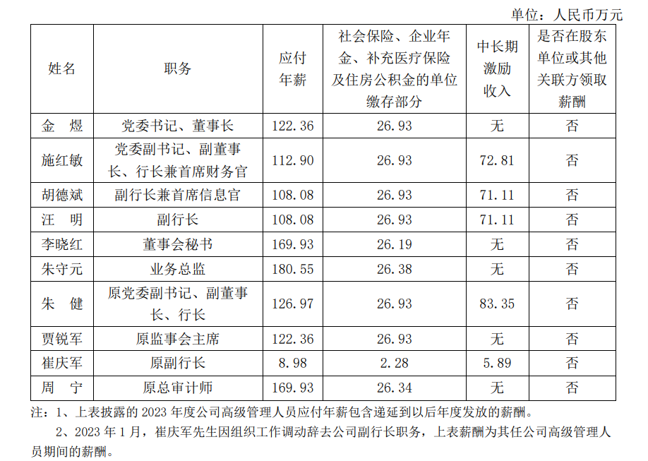党委书记、董事长金煜2023年年薪为122.36万元;行长兼首席财务官施红敏为112.90万元;副行长兼首席信息官胡德斌为108.08万元;副行长汪明为108.08万元。不过,后三者均有70余万元的中长期激励收入。