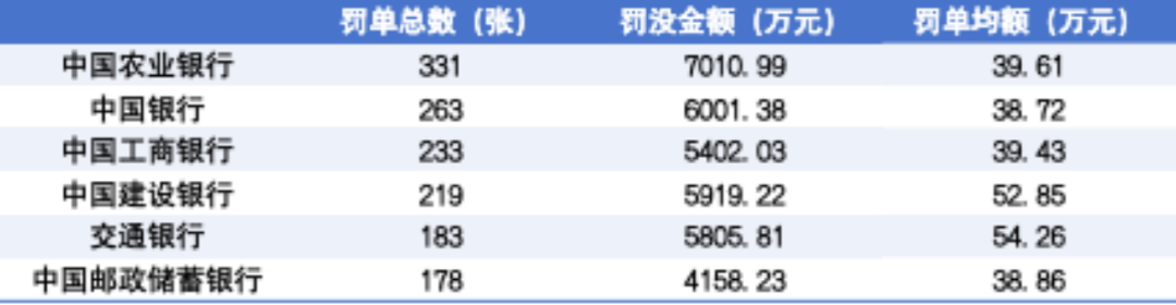 此外,国有大行分支机构较多,单家罚单数量与处罚金额均远超其他银行,共计收到罚单1407张,罚没金额3.43亿元。其中,中国农业银行收到罚单数量与罚没金额最多,累计罚没金额超7000万元。