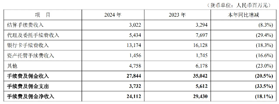 具体来看,结算手续费、代理及委托手续费、银行卡手续费、其他手续费及佣金全部下滑。