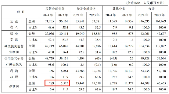 进一步看,零售金融业务下的信用及其他资产减值损失占其减值损失前营业利润的比重,2023年为89.53%,2024年进一步提高到99%,极其恶化。