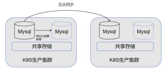 上图为容器化后 MYSQL 的架构方案,该方案使用外接共享存储,在上容的同时使用存算分离架构,是一种更加彻底的存算分离。该架构下同 IDC 内不再建设有备库,主库故障后利用 K8S 的调度和共享存储能力,在原存储上可以迅速拉起新节点实现故障转移,而在同城跨 IDC 机房建设有另外一套独立的 K8S 集群,通过数据库复制技术进行跨 IDC 主从同步。