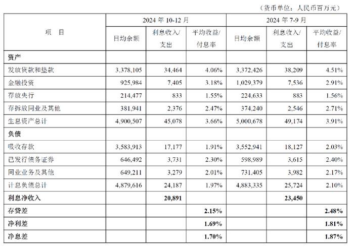 由于平安银行业务结构的特点以及主动压降零售高风险资产的影响,2024年净息差下行较大。具体来看,2024年生息资产收益率为3.97%,负债成本为2.14%,比2023年下降13个基点,资产收益率的下行要大于负债成本的下行,导致净息差明显下降。