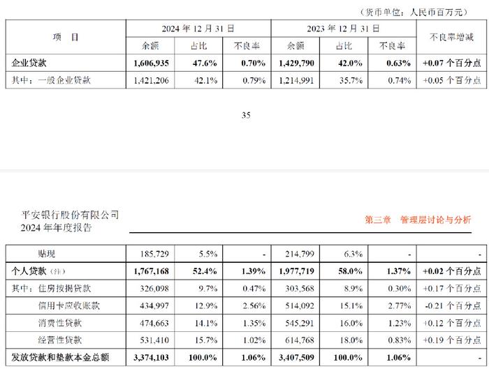 《财中社》发现,平安银行总体资产质量保持稳定,2024年末不良贷款率1.06%,与上年末持平。分结构来看,对公贷款的不良率为0.7%,比2023年上升0.07个百分点;零售的不良率为1.39%,比2023年上升0.02个百分点。