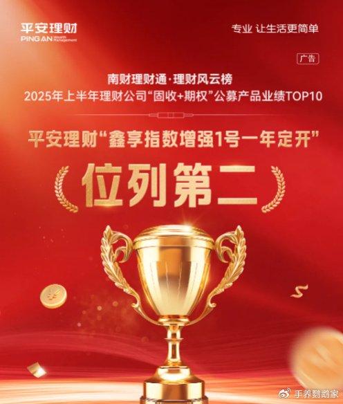近日,南财理财通发布2025年上半年理财公司“固收+期权”公募产品业绩榜单,平安银行旗下“鑫享指数增强1号一年定开”“新安鑫灵活策略一年定开6号”“鑫享全球大类资产趋势一年定开2号”三款产品强势登榜,成为上榜数量最多的理财公司之一。这一成绩不仅印证了平安银行在结构化投资领域的深厚积淀,可见平安银行理财实力一斑。一直以来,平安银行以多样化的资产收益来源、丰富的产品货架为投资者带来稳健友好的投资体验。