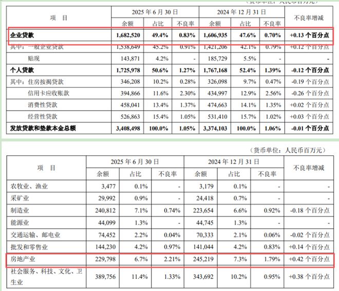 但拆分结构后如下图可见,有点“个人贷持续改善、企业贷风险抬头”的分化格局。尤其是房地产相关贷款的不良率上升,成为潜在风险点。