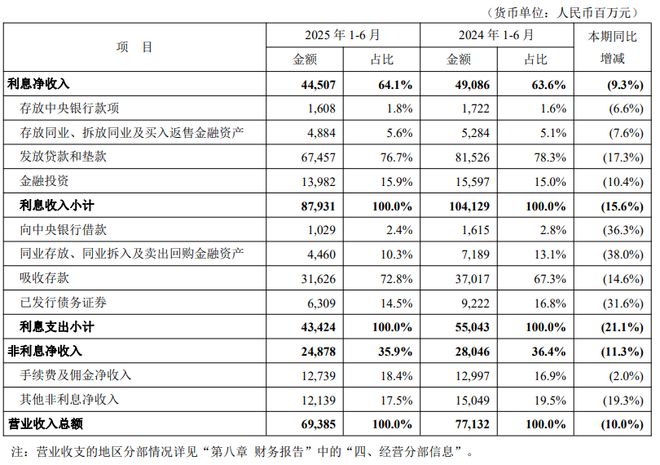 财报数据显示,2025年上半年,平安银行实现营业收入693.85亿元,同比下降10.0%;归属于母公司股东的净利润248.7亿元,同比下降3.9%,继续延续一季度的“双降”趋势。