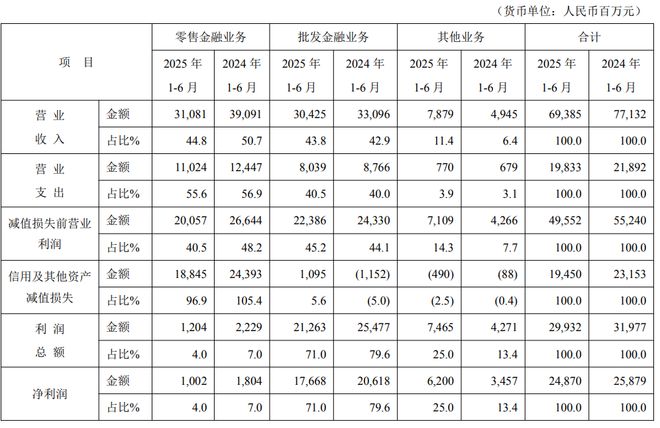 平安银行曾经引以为傲的零售业务“瘦身”仍在继续。上半年个人贷款余额下降2.3%,信用卡应收账款锐减9.2%,消费性贷款收缩3.5%。零售金融业务营业收入占比从50.7%降至44.8%,利润贡献占比从7.0%骤降至4.0%。