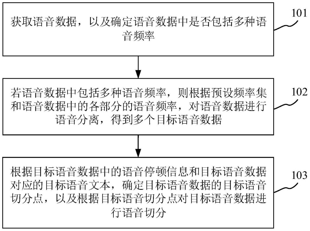 其方法包括,获取语音数据,以及确定语音数据中是否包括多种语音频率;若语音数据中包括多种语音频率,则根据预设频率集和语音数据中的各部分的语音频率,对语音数据进行语音分离,得到多个目标语音数据(其中,预设频率集中的每个预设频率对应一个目标用户,一个目标语音数据来自一个目标用户);根据目标语音数据中的语音停顿信息和目标语音数据对应的目标语音文本,确定目标语音数据的目标语音切分点,以及根据目标语音切分点对目标语音数据进行语音切分。
