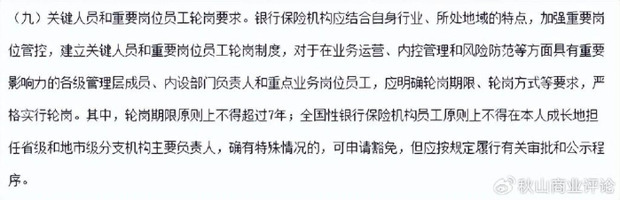 2019年末原银保监会公布的《关于银行保险机构员工履职回避工作的指导意见》,明确要求银行保险机构应结合自身行业、所处地域的特点,加强重要岗位管控,建立关键人员和重要岗位员工轮岗制度,轮岗期限原则上不得超过7年。
