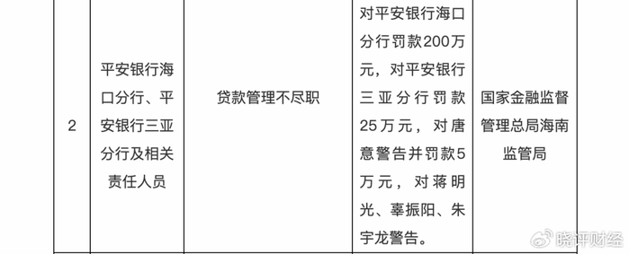 同样在11月21日,因贷款管理不尽职, 平安银行 海口分行、三亚分行分别被海南金融监管局罚款200万元、25万元,四名责任人被警告,一人被罚款5万元。