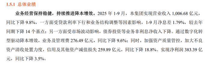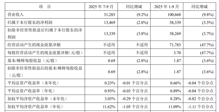 2025年前三季度, 平安银行 实现营业收入1006.68亿元,同比减少9.78%;归母净利润383.39亿元,同比减少3.5%,且2024年第三季度以来,该行已连续五个季度营业收入、归母净利润下滑。