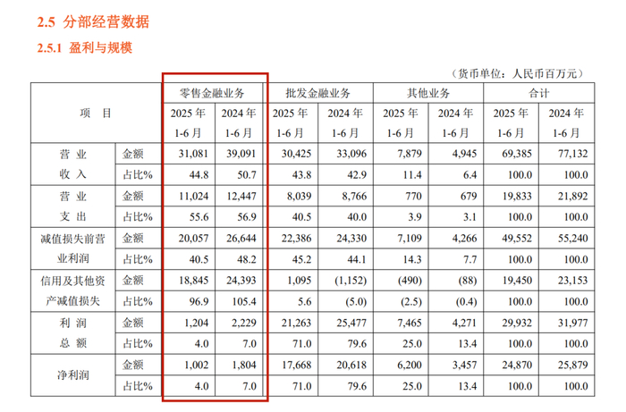 2025年上半年, 平安银行 的零售业务营业收入、净利润继续下降至310.81亿元、10.02亿元,降幅20.5%、44.5%,占比也由上年同期的50.7%、7%下降至44.8%、4%。