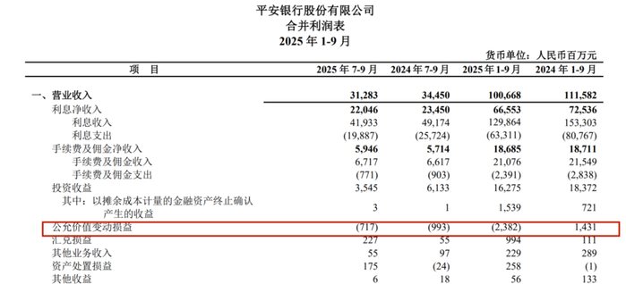 非息收入中,2025年前三季度, 平安银行 手续费及佣金净收入186.85亿元,同比减少0.14%。同时,受债市波动影响,债券投资收益下降, 平安银行 公允价值变动收益为-23.82亿元,上年同期的14.31亿元大幅减少38.13亿元,降幅高达266.5%。