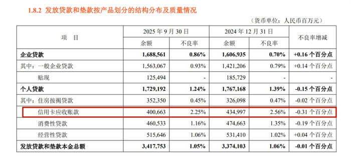 对比“零售之王” 招商银行 ,2025年9月末, 平安银行 信用卡的不良率2.25%,较2024年末下降0.31个百分点,依旧处于较高水平。