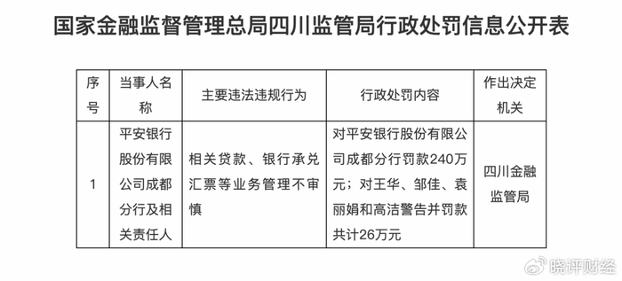 11月21日, 国家金融监督管理总局四川监管局 发布行政处罚信息公开表。因相关贷款、银行承兑汇票等业务管理不审慎, 平安银行 成都分行被罚款240万元,四名相关责任人被警告并罚款共计26万元。