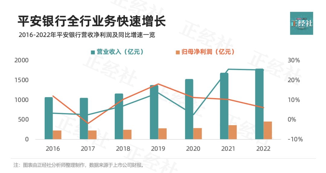 根据年报提供的数据,2016年至2022年, 平安银行 营收同比增速分别达12.01%、-1.79%、10.33%、18.20%、11.30%、10.32%、6.21%,归母净利润同比增速分别达3.36%、2.61%、7.02%、13.61%、2.60%、25.61%、25.26%。