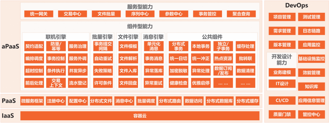 3.自研平台赋能,掌控核心技术组件。IaaS,通过容器化实现计算资源的弹性,无感应对爆发流量的同时,降低软硬件投入成本。PaaS,通过成熟微服务框架、基础中间件等,提供通用技术平台能力,降低应用开发难度,同时保证健壮性。在PaaS平台基础上,项目组自主研发了联机引擎、文件引擎、批量引擎、消息引擎、分布式事务、序列中心、参数缓存等核心组件,形成覆盖交易全链路的“自研技术中台”。通过自研IT设计平台,实现了从业务模型到代码生成的全链路拉通。这些开箱即用的技术能力,不仅降低了开发门槛,更通过统一的技术范式确保了系统的高可用性,让科技研发从“烟囱式”手工打造转向“平台化、标准化、敏捷化”的流水线生产,其技术架构如图2。