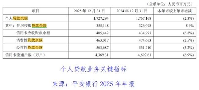 部分指标则释放出止跌回稳的积极信号。平安银行行长助理王军介绍称:“从环比走势看,2025年上半年零售贷款规模下降412亿元,但下半年实现正增长13亿元,已基本实现止跌回稳。从产品结构看,信用卡分期和信用卡循环资产企稳,按揭、汽车融资余额保持正增长,橙e贷、橙业贷余额突破300亿元。”