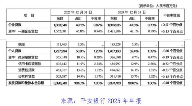 国联民生证券在研报中指出,平安银行部分重点领域不良率仍有上升压力。其2025年末贷款不良率虽企稳,但重点领域资产质量仍承压。从零售端看,2025年第四季度末消费贷、信用卡不良率虽改善较多,但经营贷不良率明显上升。