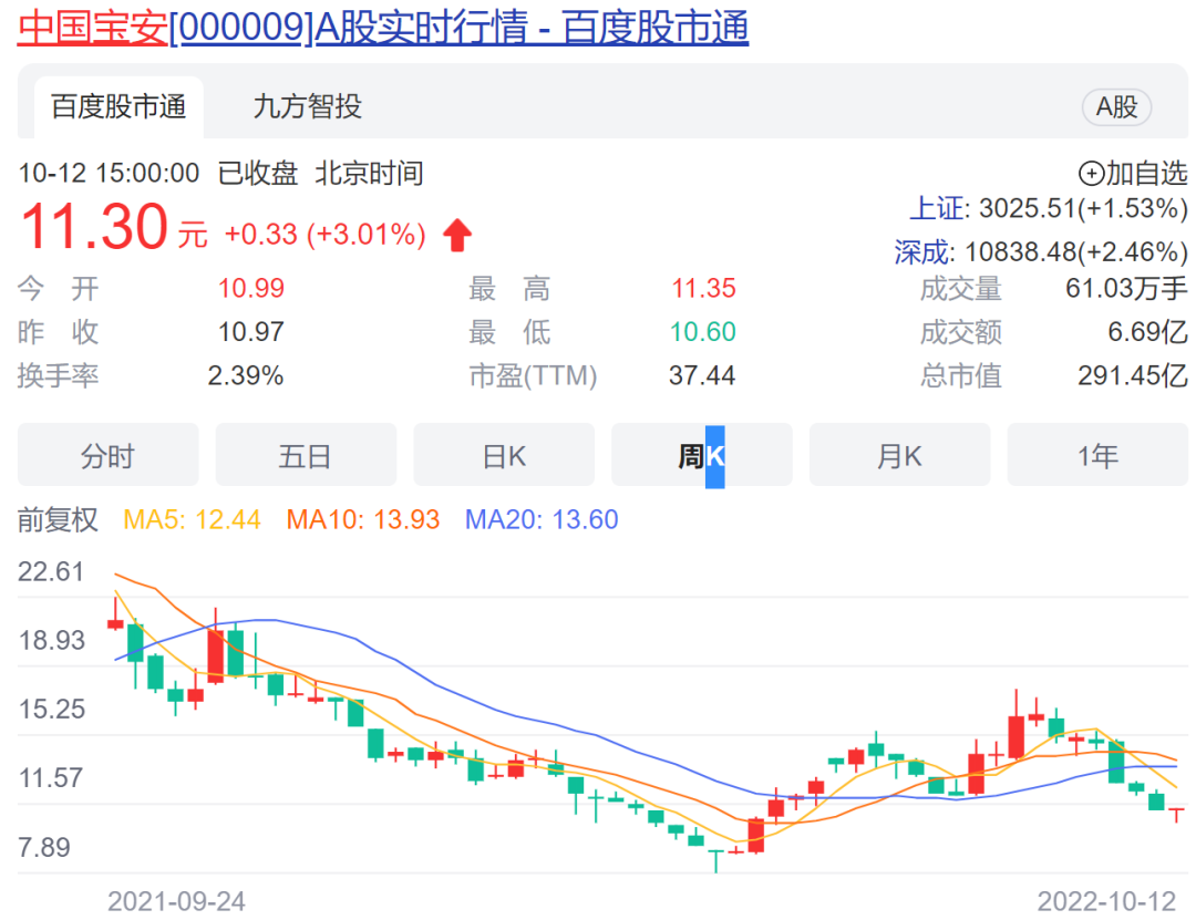 年初至今,中国宝安股价累计下跌21.53%。截至10月12日收盘,中国宝安涨3.01%,报11.3元,总市值291亿元。