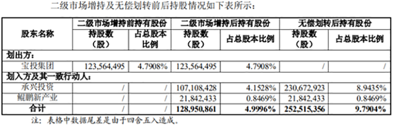 本次无偿划转后,承兴投资与鲲鹏新产业合计持有中国宝安2.52亿股股份,占中国宝安总股本的9.7904%。