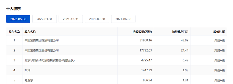截至2022年第二季度末,贝特瑞第一、第二大股东分别是中国宝安集团控股有限公司、中国宝安,而第五大股东为葛卫东。