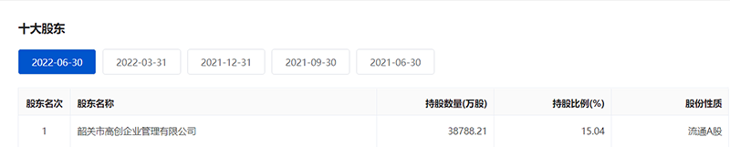 截至2022年6月30日,粤民投旗下韶关市高创企业管理有限公司,持有中国宝安的股份比例达15.04%。