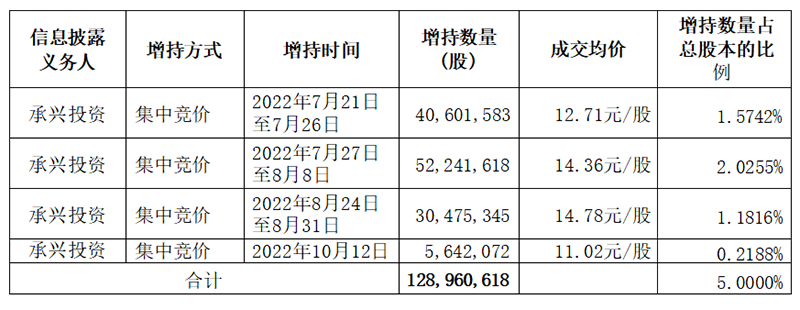 7月21日至10月12日,承兴投资以自有资金合计17.79亿元,合计增持中国宝安1.29亿股,增持股份比例5%。