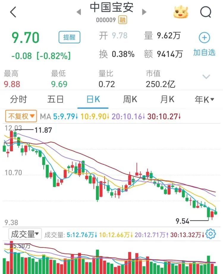 二级市场上,中国宝安今日收盘报9.70元/股,跌0.82%,最新总市值250.2亿元。