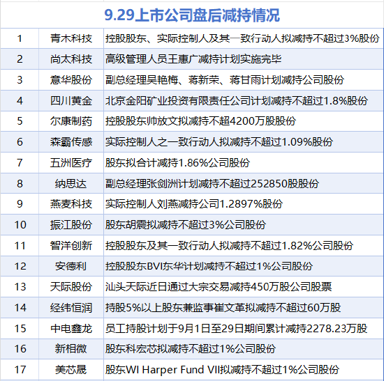 据统计,9月29日,盘后中国宝安、西子洁能披露增持情况。包括青木科技、尚太科技、意华股份、四川黄金、尔康制药、森霸传感、五洲医疗、纳思达、振江股份、燕麦科技、智洋创新、安德利、天际股份、经纬恒润、中电鑫龙、新相微、美芯晟在内的17家A股上市公司披露减持情况。