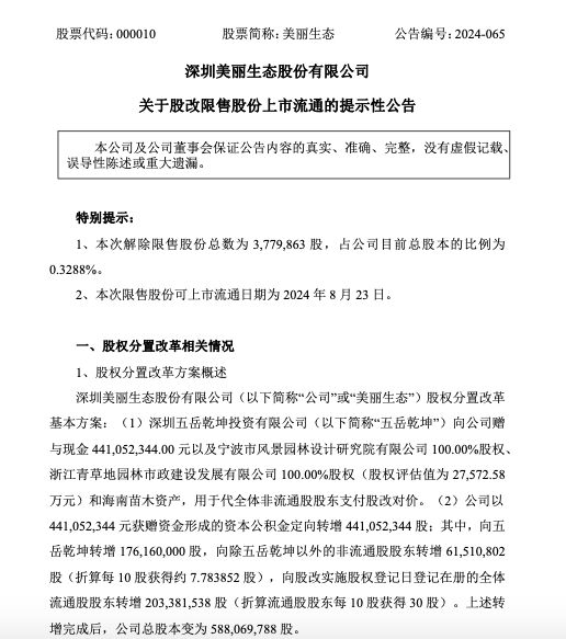 美丽生态在当日另一则关于股改限售股份上市流通的提示性公告中称,公司解除限售股份总数为3,779,863股,占公司目前总股本的比例为0.3288%。本次限售股份可上市流通日期为2024年8月23日。