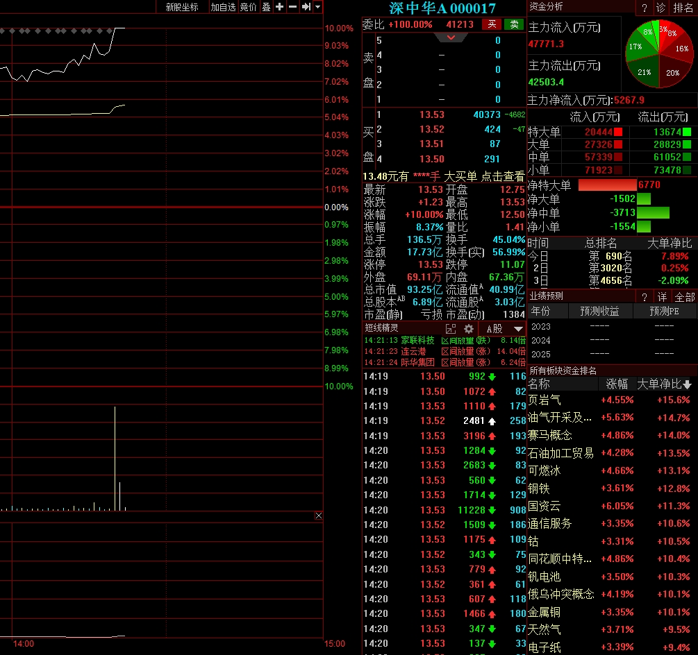 25日临近尾盘,深中华A涨停,录得13天12板,截至发稿成交额超17亿元,报13.53元,总市值93.25亿元。