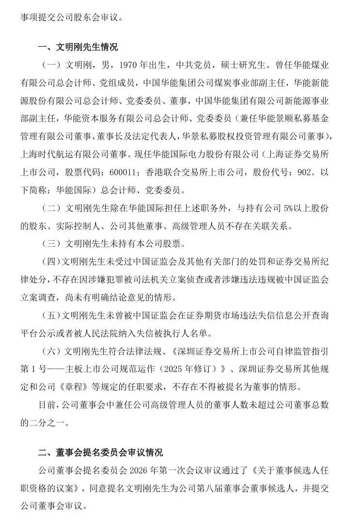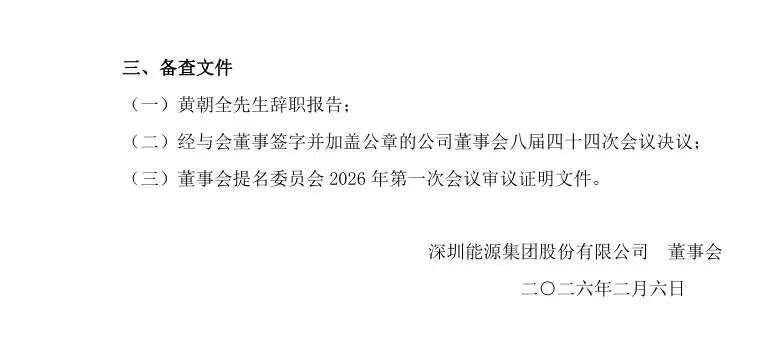 北极星氢能网获悉,2月6日,深圳能源发布公告称,近日收到黄朝全先生提交的书面辞职报告。黄朝全先生因工作原因辞去公司第八届董事会董事、副董事长职务,同时辞去董事会战略与可持续发展委员会委员和薪酬与考核委员会委员职务,辞职后不在公司及公司控股子公司担任任何职务。