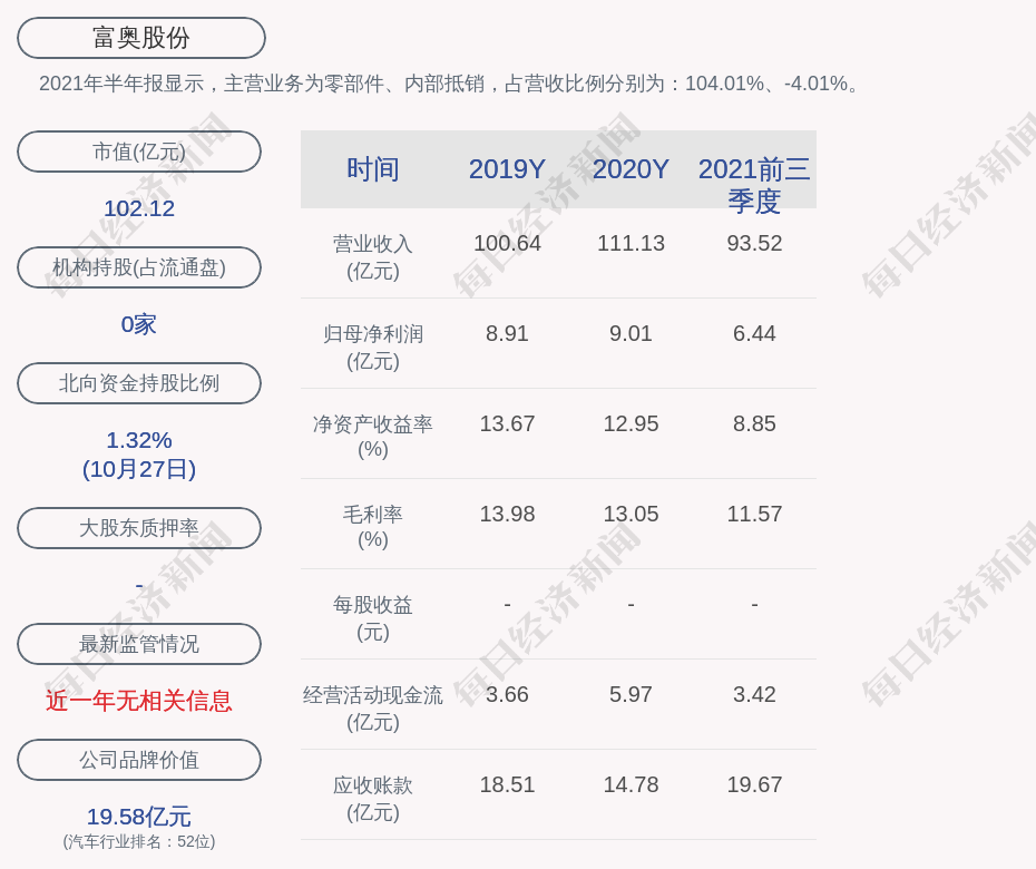 2021年半年报显示,富奥股份的主营业务为零部件、内部抵销,占营收比例分别为:104.01%、-4.01%。