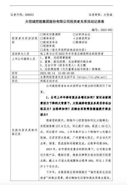 9月14日,大悦城控股集团股份有限公司(以下简称“大悦城”或“公司”)发布公告称,公司于9月14日下午召开了2023年半年度业绩说明会。在会议上,大悦城透露,未来,公司投资布局仍将聚焦一二线城市核心区域,围绕抗风险能力强、周转率高、盈利稳定、安全性强的城市和区域进行投资聚焦,持续优化投资结构,实现稳健扩张。