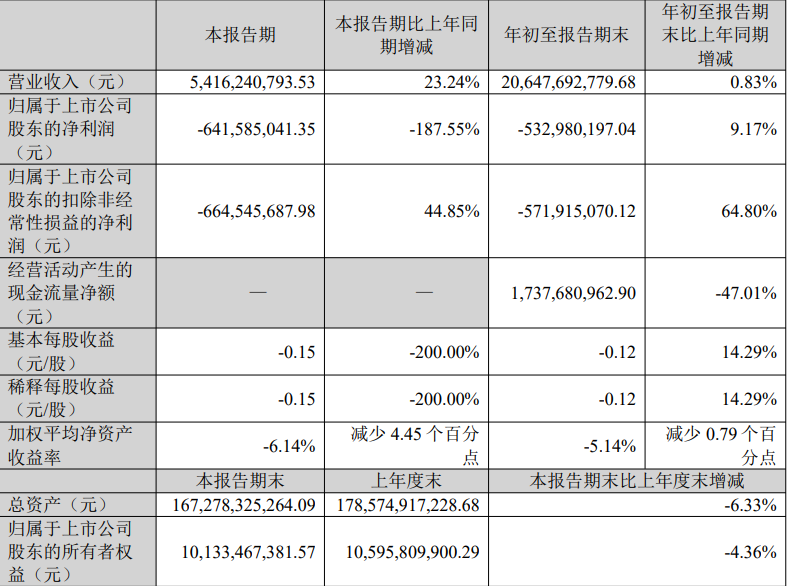 然而亮眼的营收并未带来盈利,公司同期录得归属于上市公司股东的净利润为-6.42亿元,同比下降187.55%。扣除非经常性损益后,归母净利润为-6.65亿元,同比增长44.85%。