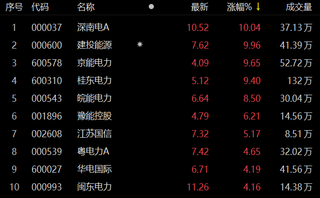 6月26日,电力股表现活跃,截至9:51,深南电A、建投能源涨停,桂东电力、京能电力涨超9%。