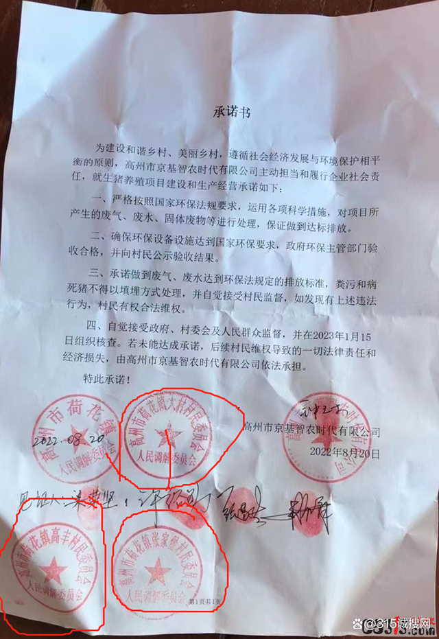 作为《承诺书》的承诺单位,高州市京基智农时代有限公司在几位村民的见证下,与荷花镇人民调解委员会、大村村民委员会、高丰村民委员会、张家堡村民委员会签订了环保整改协议,并承诺于2023年1月15日前确保环保设施符合要求。