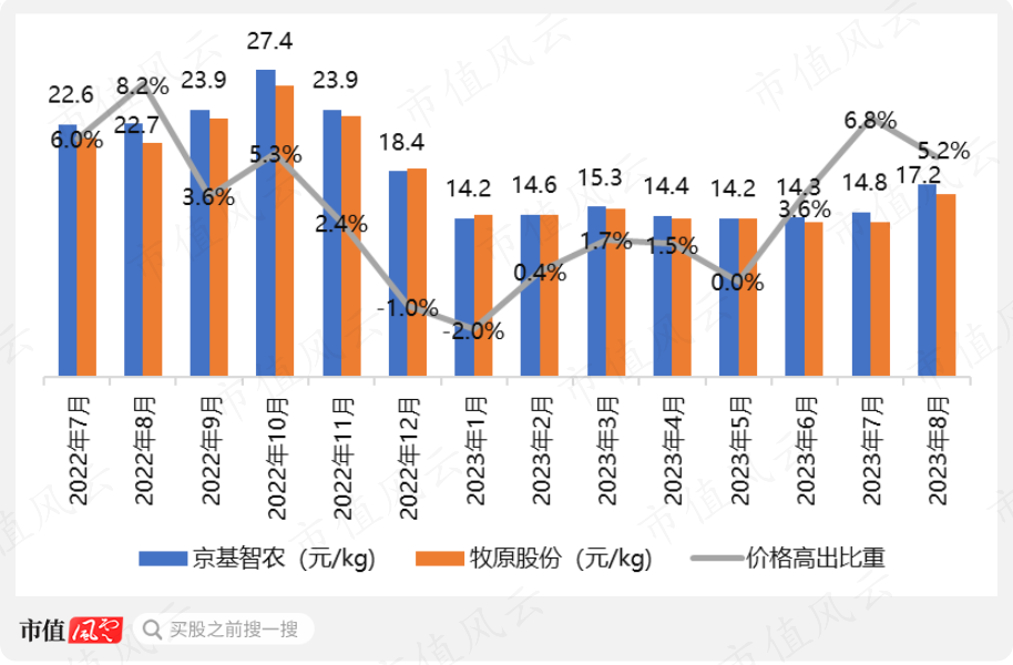 这比京基智农2023年1-8月16.6元/Kg的育肥猪平均养殖成本低不少,虽然京基智农表示8月份的育肥猪成本约为15.8元/Kg,但仍较牧原股份7月份全成本高出10.5%。