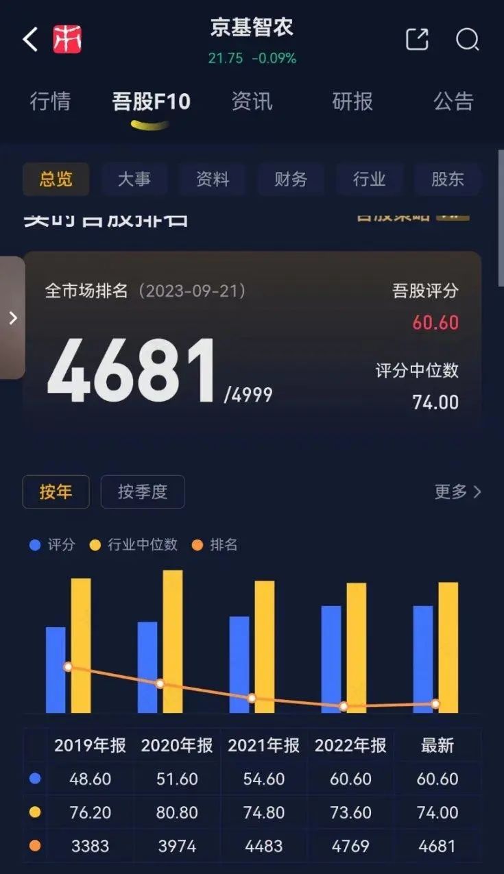 但在吾股大数据中,这家公司过去4年的排名始终在4000名开外波动,而且排名持续向下,京基智农被错杀了?