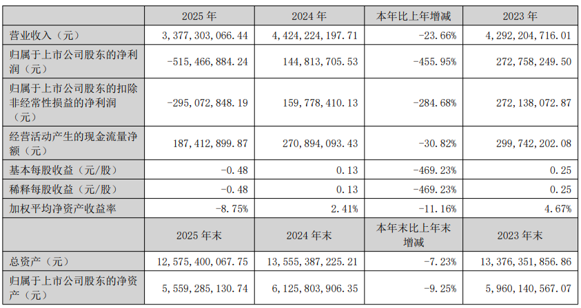 4月7日晚间,老牌上市公司方大集团(000055.SZ)披露2025年年度报告,交出了一份近年来罕见的亏损答卷。报告期内,公司营收利润双双大幅下滑:实现营业收入 33.77亿元,同比下降23.66%;归母净利润亏损5.15亿元,同比下降455.95%;扣非归母净利润亏损2.95亿元,同比下降284.68%;基本每股亏损0.48元,同比下降469.23%。
