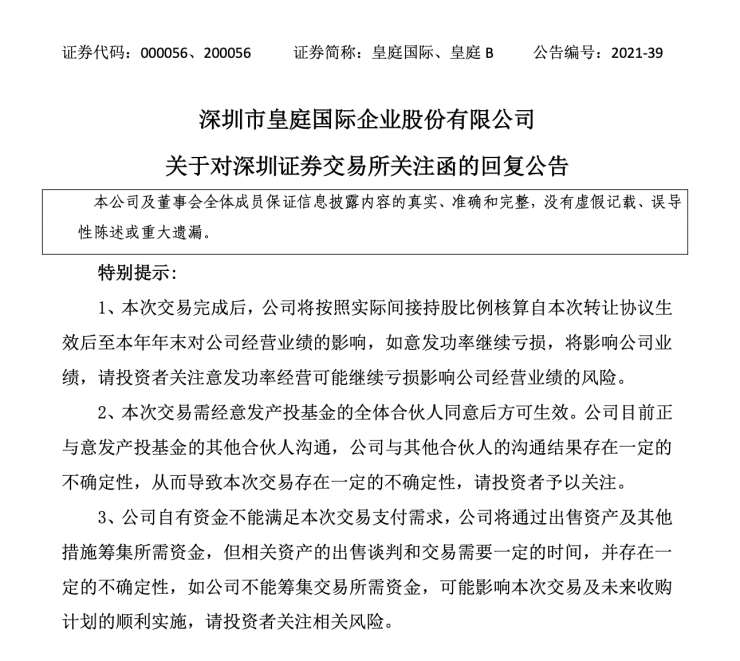 皇庭国际回复深交所公告称,他们不是炒作蹭热点,自有资金不足支付交易需求,会通过出售资产等其他措施筹措资金,深圳皇庭广场赫然出现在资产列表中。