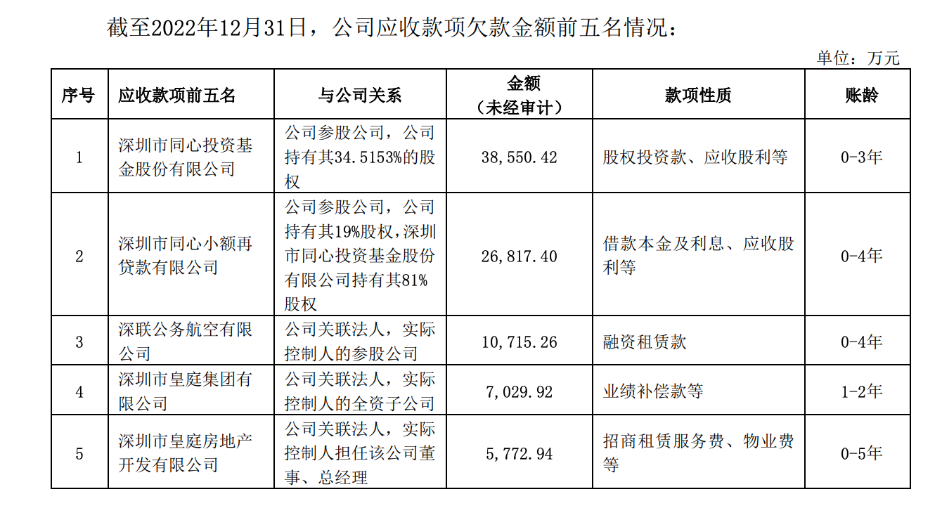 据皇庭国际披露,截至2022年12月31日,公司应收款项欠款金额前2名为深圳市同心投资基金股份有限公司(下称“同心基金”)、深圳市同心小额再贷款有限公司(下称“同心再贷”)。