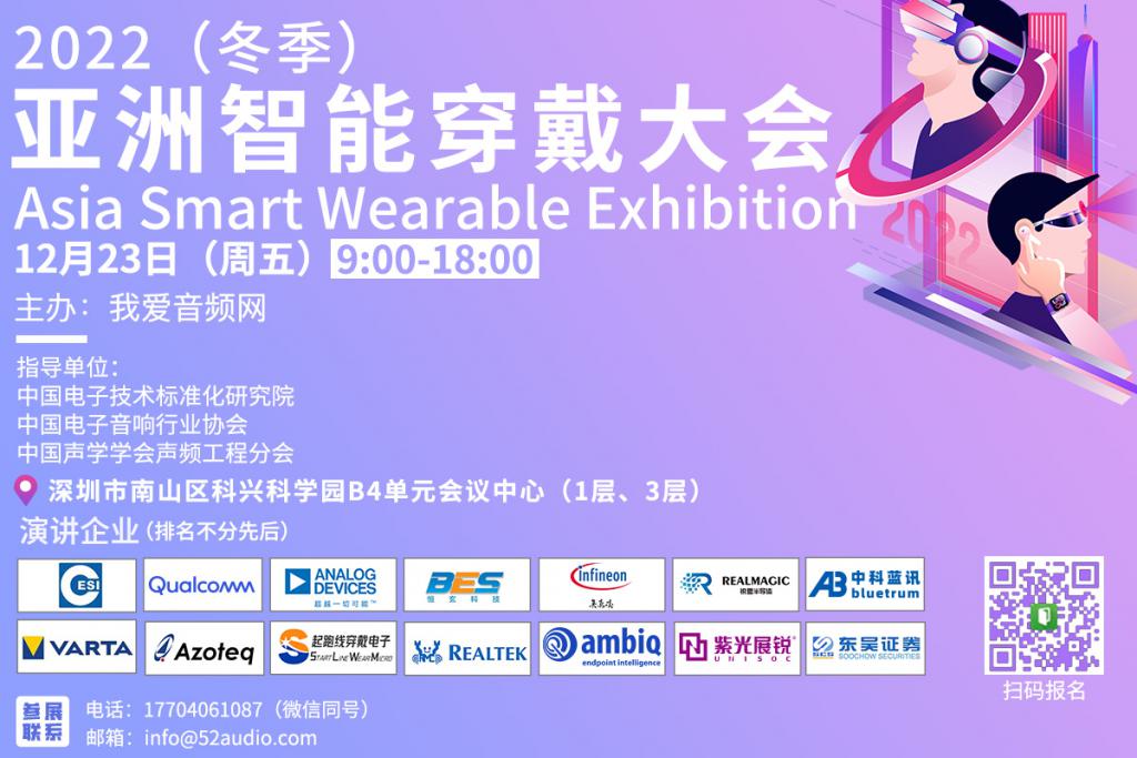 【2022(冬季)亚洲智能穿戴大会】由我爱音频网主办,采用展会与大会相结合的模式,已经成功举办五届。大会旨在为产业链企业搭建一个新品发布、技术交流的平台,并连接智能穿戴设备上下游市场,帮助参展企业找到优质合作伙伴、为品牌客户提供优质供应商、为行业提供技术发展趋势引领、促进智能穿戴领域优质企业实现合作共赢,促进智能穿戴设备市场蓬勃发展。