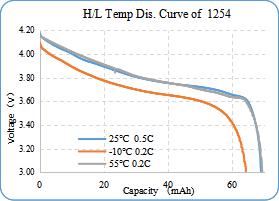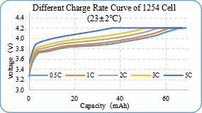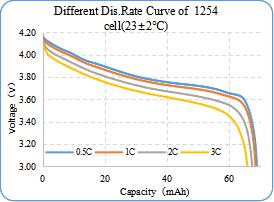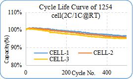 以 1254 为例,常温环境下,2C 充电到 4.4V-1C 放电的 500 次容量保持率仍有 90%以上,3 分钟可充满 25%的电量,3C 倍率下仍有 95%的容量发挥,能满足在特定场合下的大电流使用。在零下 10 度的恶劣条件下条件下能稳定输出 90%以上的电量。