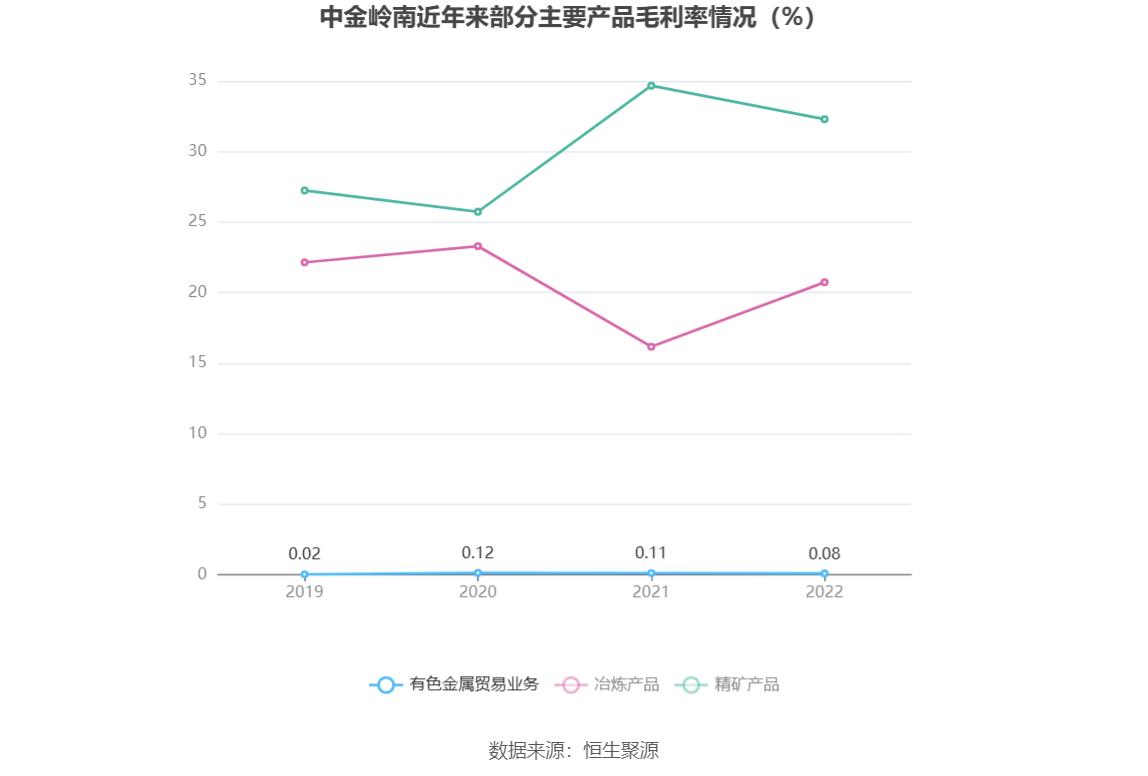 分产品看,有色金属贸易业务、冶炼产品、精矿产品2022年毛利率分别为0.08%、20.73%、32.29%。